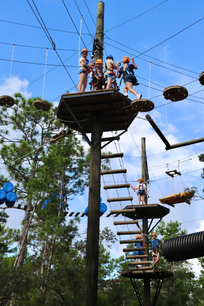 Our course rises 28 feet high in the pines! Featuring a continuous belay system and 17 elements that vary in difficulty, participants can choose their own path and challenge themselves. For an extra thrill, you can exit the course by our zipline or the Dyno – which lowers you from a top platform. There is no better way to spend a field trip, bond with coworkers, or make memories with family.